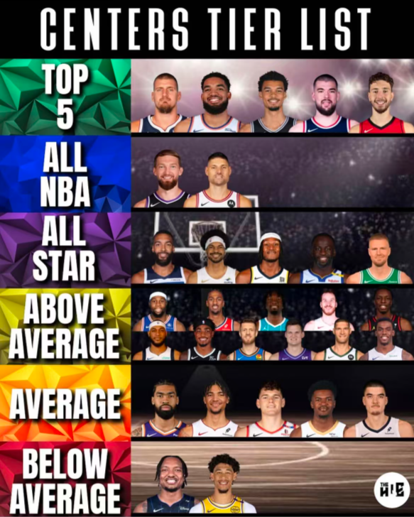 2025年男篮欧洲杯正在进行,1/16决赛正要打响,有多位现役的NBA球员都在努力为国打拼,中锋位置上有波尔津吉斯、约基奇、申京、瓦兰、努尔基奇等还没有被淘汰。北京时间9月6日,美媒thehopen以上赛季的表现与欧洲杯的综合表现为现役中锋进行了分档。
